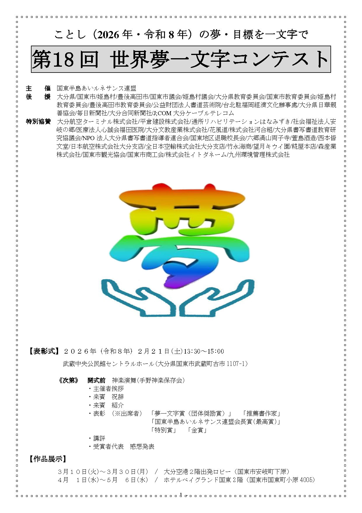 2026年の夢を漢字一文字で揮毫する「夢一文字コンテスト」。 全国・台湾・カンボジア・ドイツ・アメリカ・フランスなどから、5900点の応募がありました。 みなさま、ありがとうございました。 入選者の表彰式は、令和8年2月21日に、大分県国東市の「武蔵セントラルホール」で開催されました。