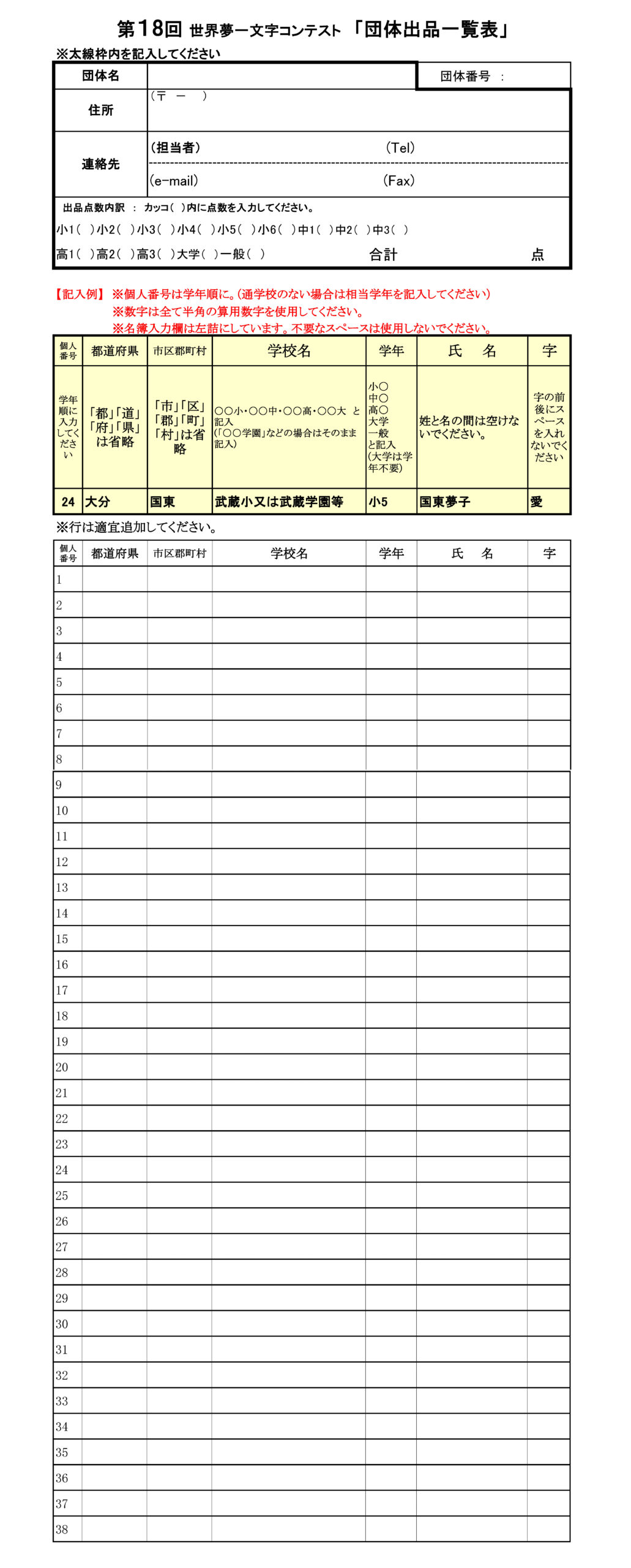 世界夢一文字コンテスト 世界夢一文字コンテストについてのご連絡をメールでお送りいただく場合は下記のメールアドレスへ送信ください。 yumehitomoji@kunisakiairune.com 上記の作品募集案内のPDFはこちらよりダウンロードいただけます。 第18回世界夢一文字コンテスト作品募集(PDF) 上記の団体出品一覧表のExcelファイルはこちらよりダウンロードいただけます。 団体出品一覧表(Excel) 第17回世界夢一文字コンテストの審査結果はこちらのページになります。 第16回世界夢一文字コンテストの審査結果はこちらのページになります。 第15回世界夢一文字コンテストの審査結果はこちらのページになります。 第14回世界夢一文字コンテストの審査結果はこちらのページになります。 第13回世界夢一文字コンテストの審査結果はこちらのページになります。
